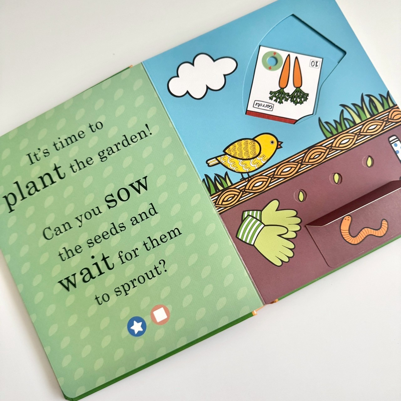 這頁用 sow 和 wait 帶出「播種→等待」的種植邏輯,孩子翻開、觀察土壤的過程,也練習耐心與期待。