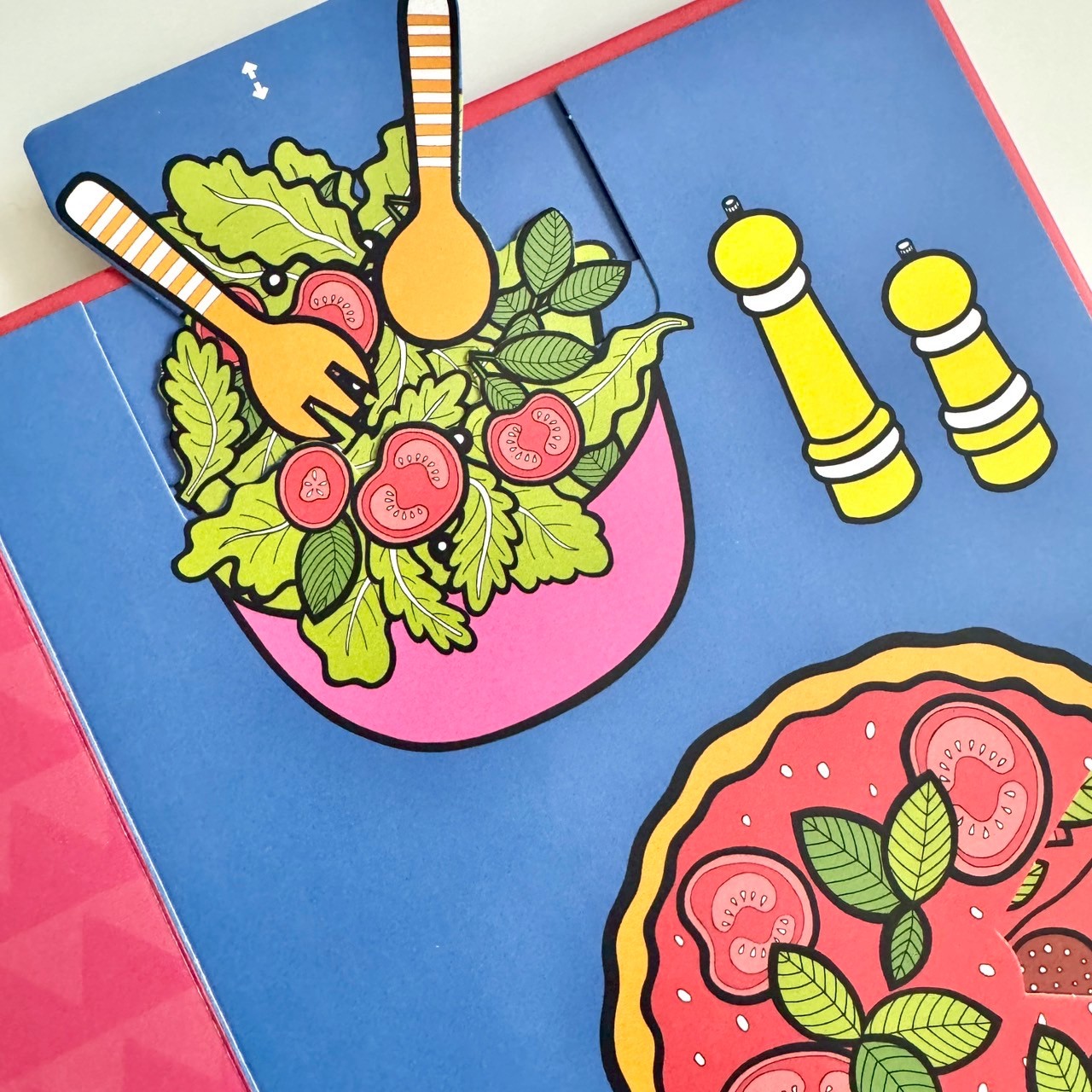 這頁的機關特別有成就感,孩子可以上下滑動叉匙拌蔬菜,加上點讀聽到 slice 和 toss 這兩個動詞。學語言不是死記,而是理解:原來 toss 就是拌沙拉的那個動作啊~