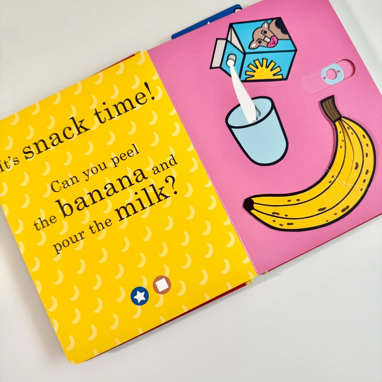 這頁的機關設計一邊一片片剝開香蕉皮,一邊將牛奶倒進杯子,對應句子 “Can you peel the banana and pour the milk?”,孩子邊做邊聽,自然把 peel 和 pour 這兩個動詞記下來,操作中也培養動作的順序感。