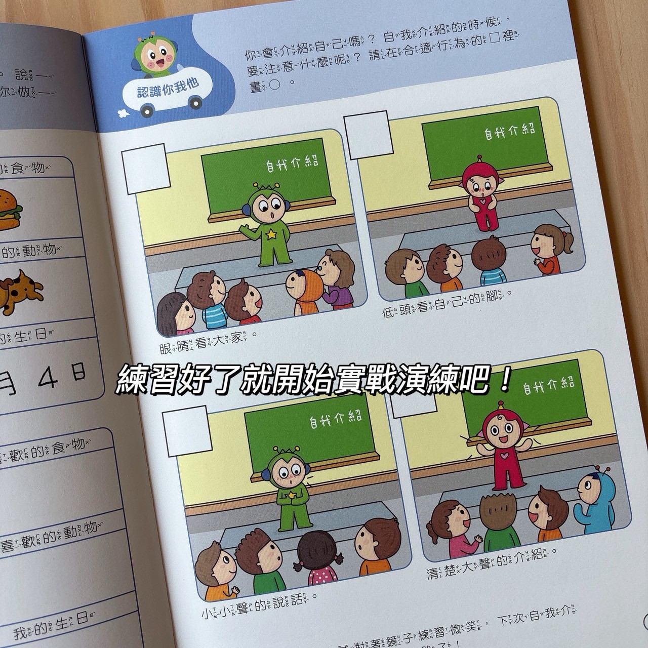 這系列的練習本最打動我的是它的設計節奏,它沒有一開始就說教,也不是填鴨式寫寫寫,而是透過畫畫、圈選、角色扮演這些孩子喜歡的形式,把「生活自理」、「情緒練習」、「人際互動」、「安全守則」一點一滴融進日常裡。