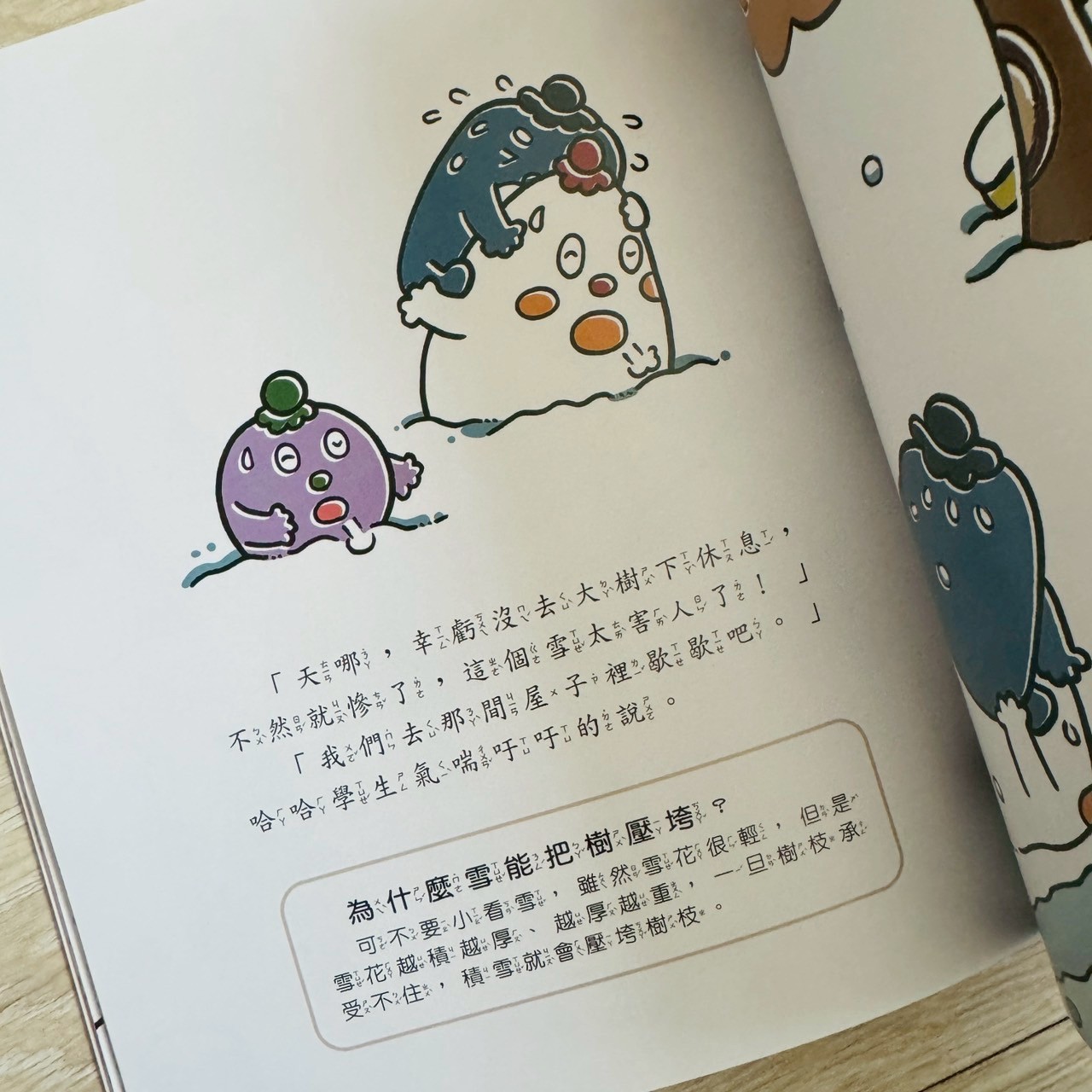 故事裡角色被雪埋住,帶出「雪太重會壓壞樹木和屋頂」。原來白茫茫的雪也有危險。