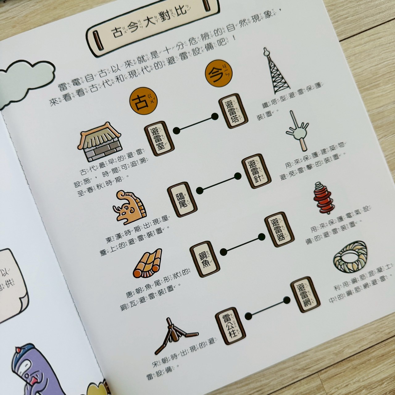 古時候人用土屋、獸角避雷,現代有避雷針,知識延伸到科學史,孩子會覺得很新鮮。