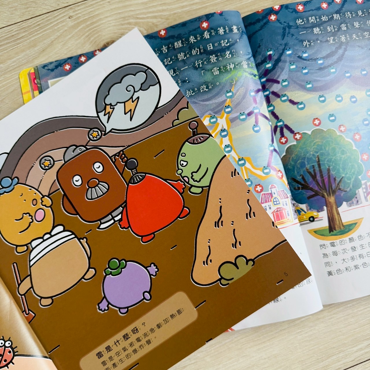 孩子最怕打雷,看到角色嚇得蹦起來,既能共感,也能學到「雷是電放電造成」。