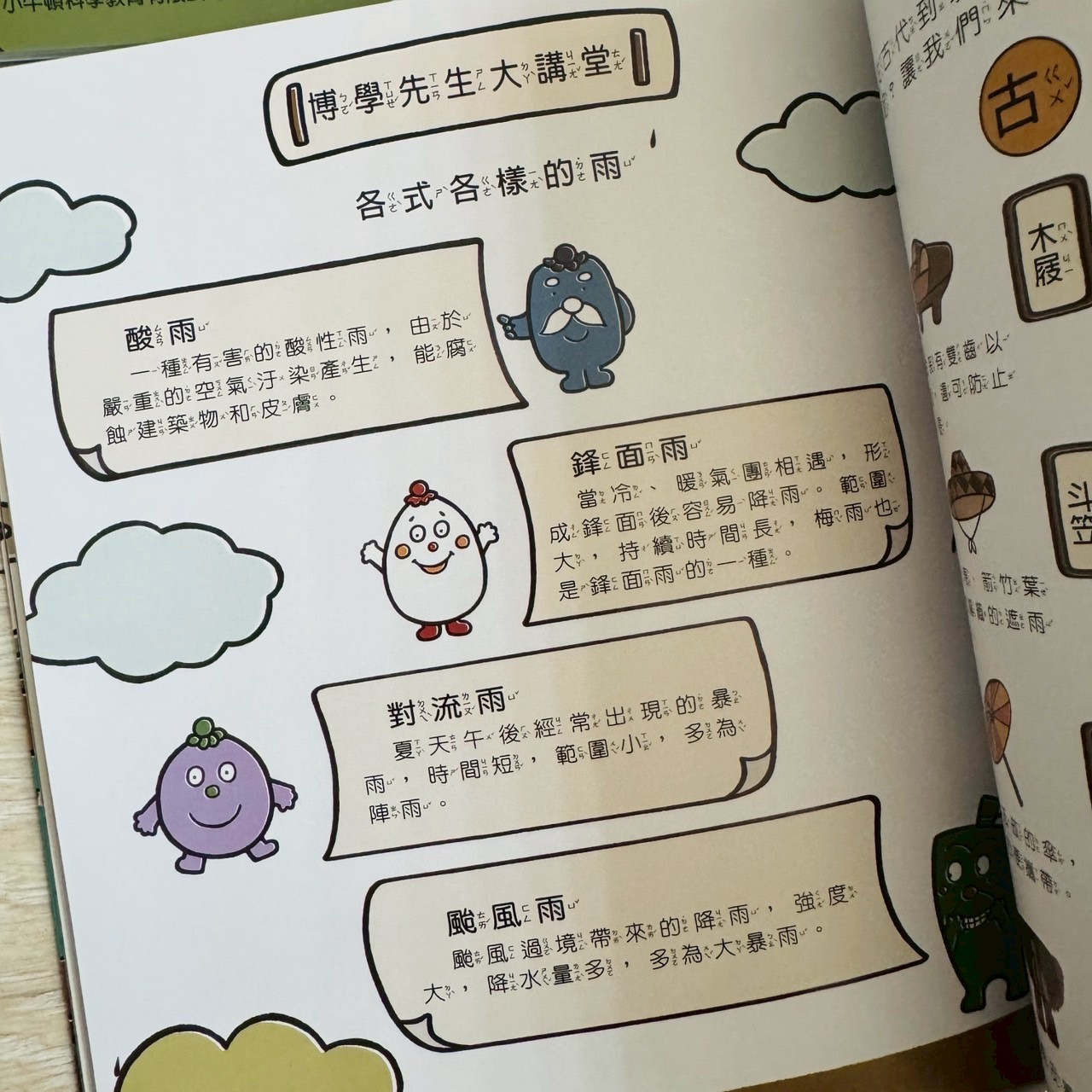 故事後面還會有「博學先生大講堂」、「古今對比」、「生活小知識」,讓孩子不只理解天氣現象,還能學到跟生活、歷史、環境相關的延伸知識,讓孩子先沉浸在幽默有趣的劇情裡,然後偷偷帶入科學常識與安全觀念。