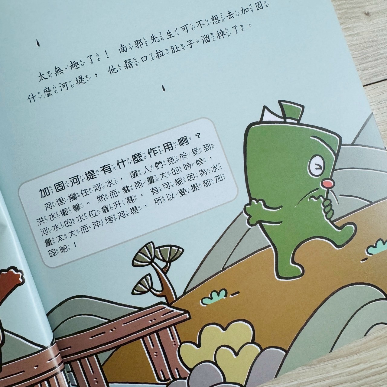 故事延伸到防災,讓孩子知道大雨可能造成洪水,還有「為什麼要加固河堤」。知識和生活安全結合,超實用。