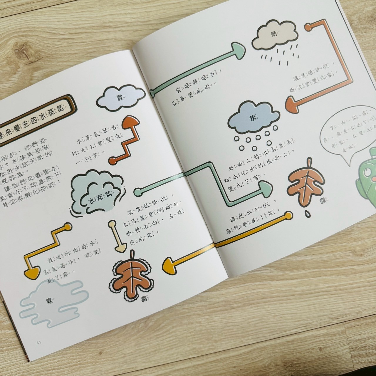 從蒸發到凝結到降水,用簡單箭頭和插畫說明,孩子馬上懂「水去哪裡了」。