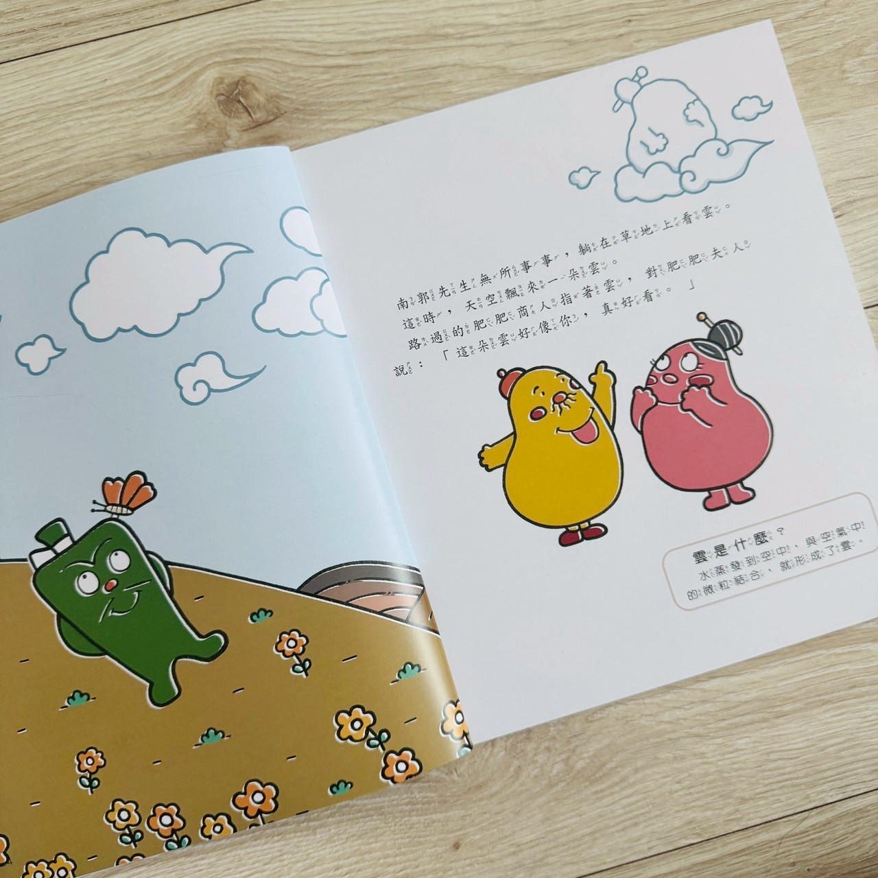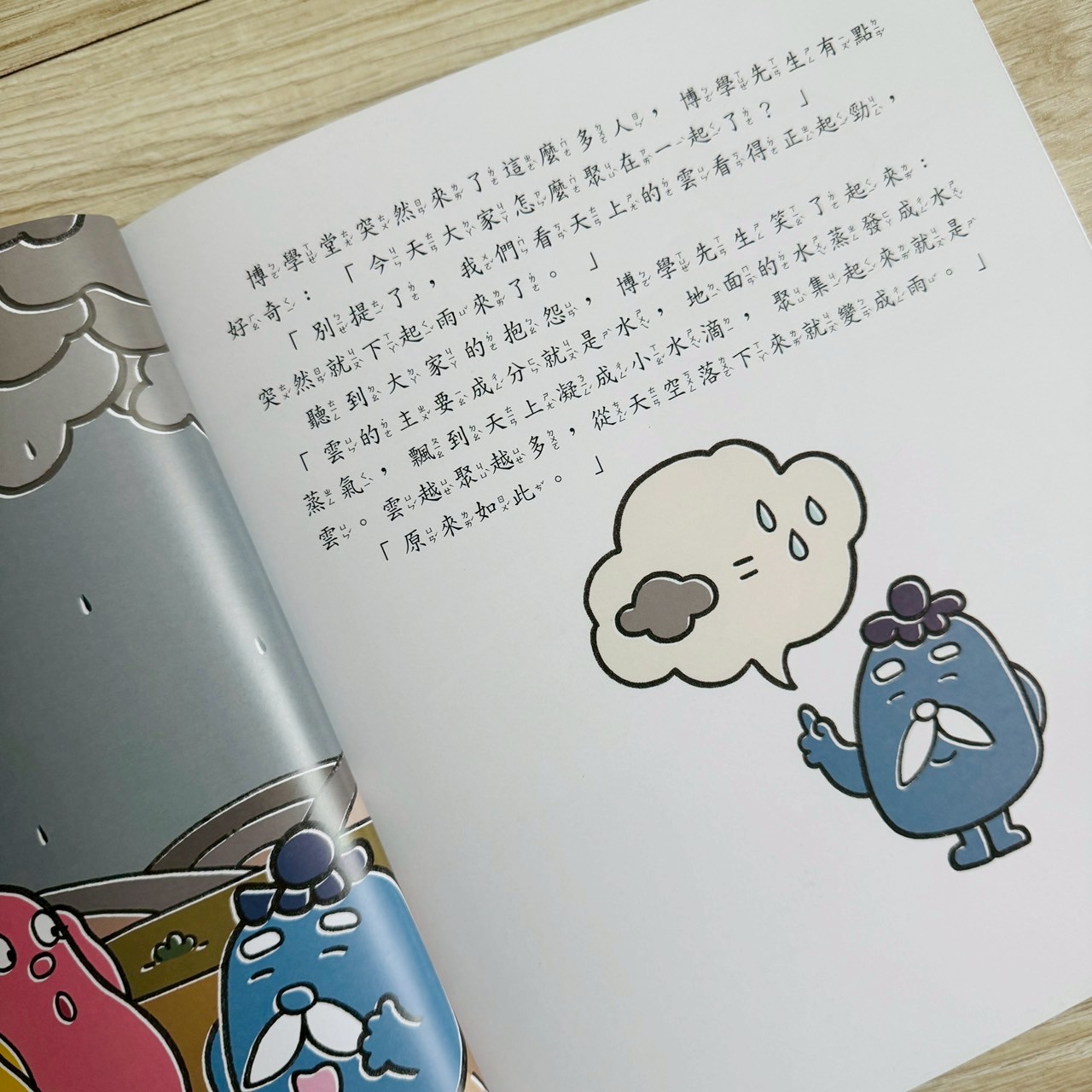 故事中穿插知識小講堂,雲的主要成分是水滴和冰晶。可愛的博學先生用和居民們對話講知識,知識藏在故事中,孩子聽得下去,家長也不用硬背課本式解釋。