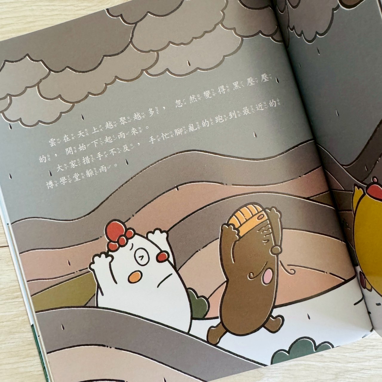 天空突然暗下來,角色們手忙腳亂躲雨。孩子在情境裡能感受下雨就是雲變成雨滴。