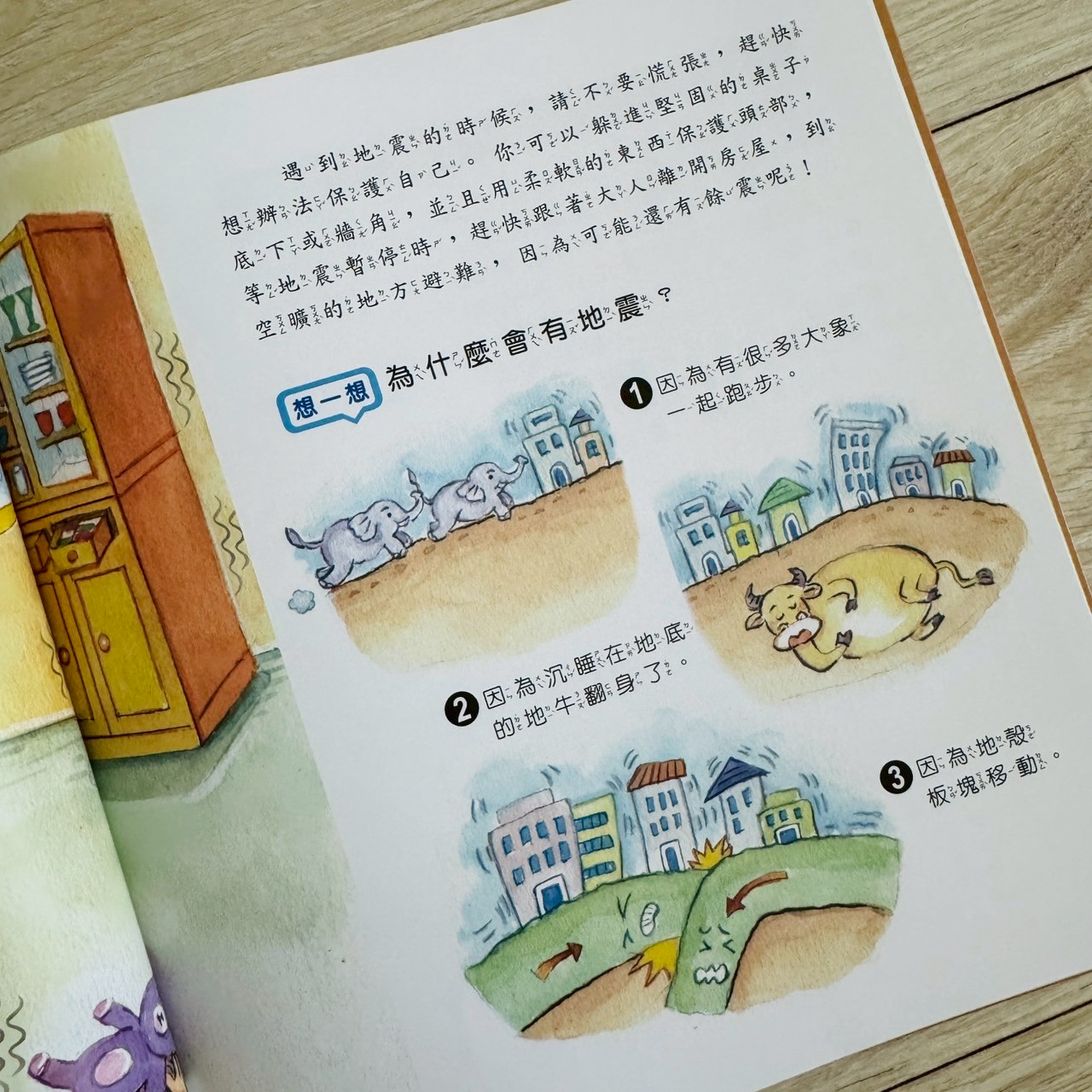 接著是地牛翻身的趣味插畫,讓孩子想一想,下一頁才進入板塊推擠的專業圖。