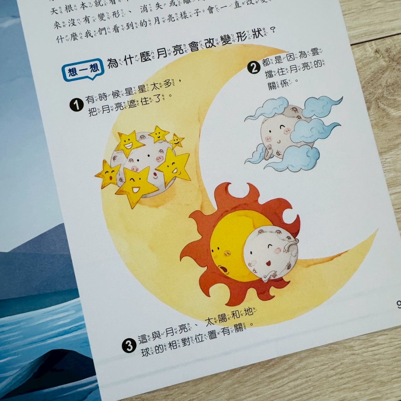 先用星星、雲朵遮月亮的趣味想像吸引注意,再進到太陽、地球、月亮相對位置的科學圖,讓趣味與科學無縫轉換。