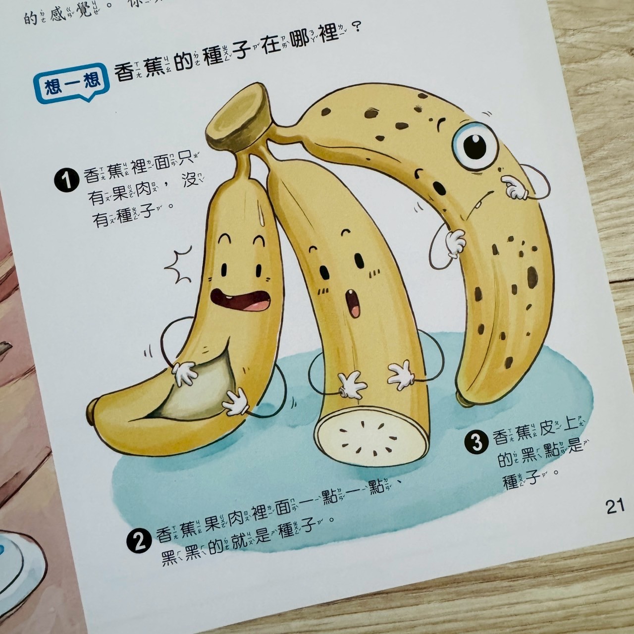 它不會一開始就丟出艱深的大名詞,而是從最日常、最像孩子會冒出來的「各種怪問題」切入:鼻屎怎麼來、橘子皮為什麼會噴汁、螃蟹只能橫著走嗎、鱷魚為什麼老張嘴、香蕉的種子藏在哪裡、花是不是女生、榴槤為什麼長滿刺。