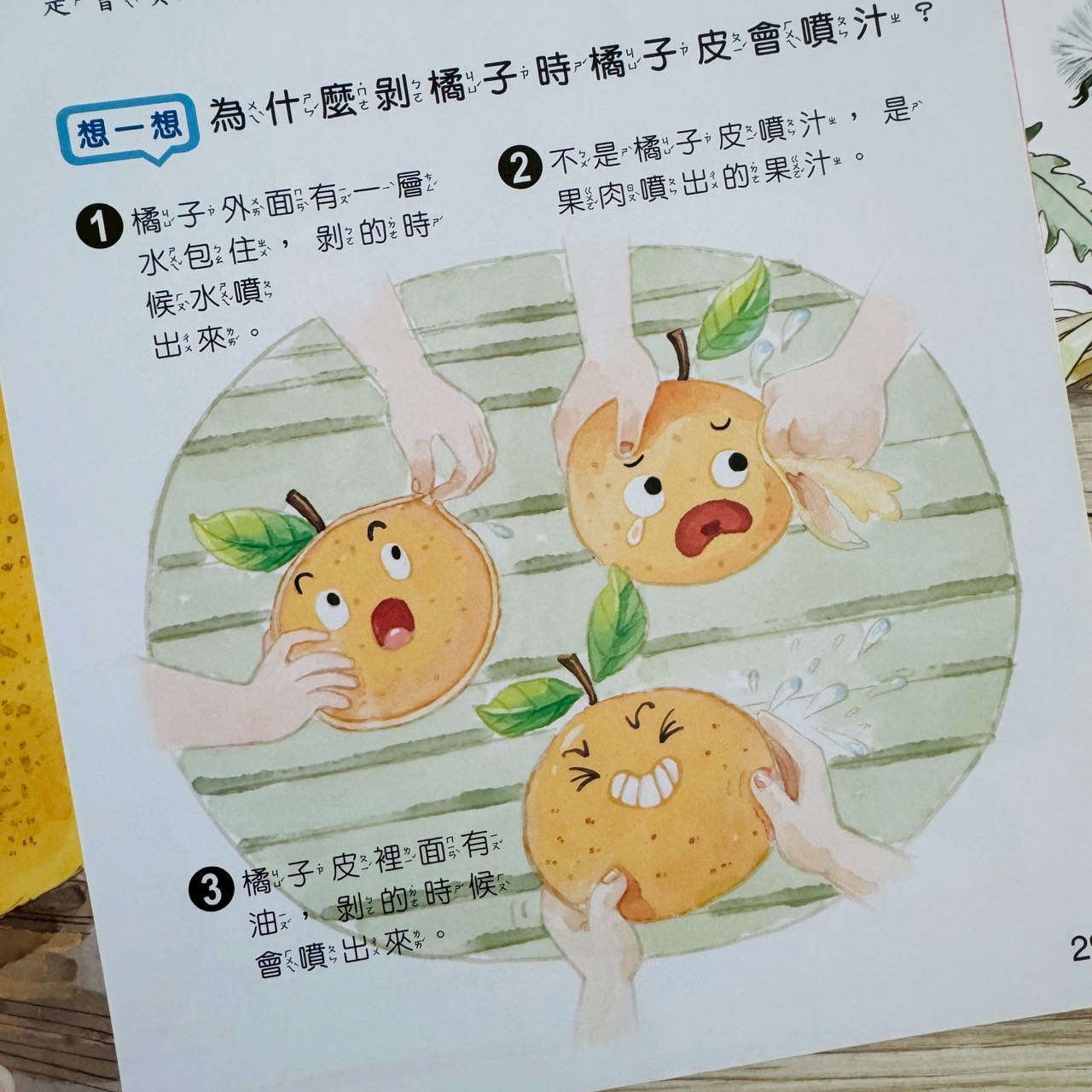 圖裡的橘子被捏得皺眉大哭,孩子一看就能笑出來。翻頁後才發現,答案不是「橘子哭了」,而是橘子皮裡有油胞,剝的時候會噴出。
