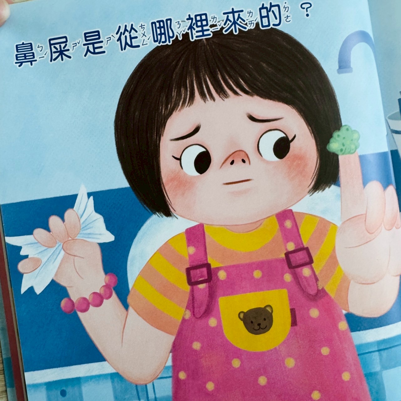 小女孩看著手指上的綠色小球,孩子立刻產生共鳴。下一頁拆解鼻腔的原理,讓「噁心的東西」變成「可以理解的科學」。