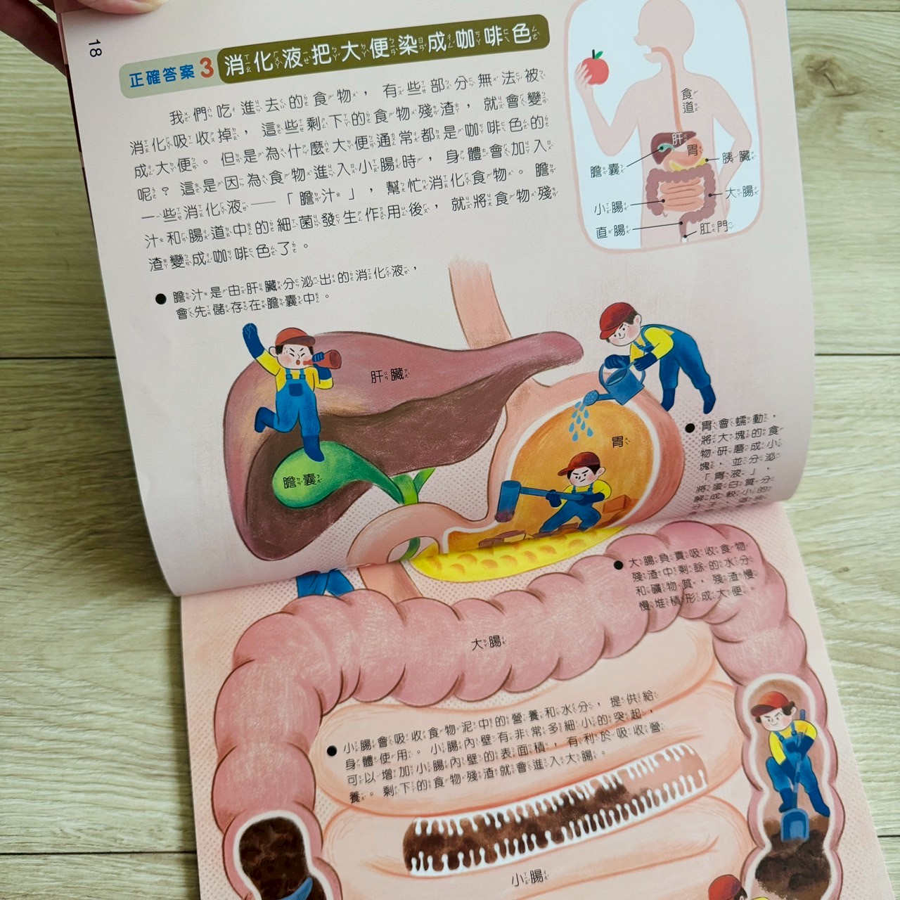 在這裡有完整答案。書裡把整條消化道畫得像一個運作工廠,還有小人物在裡面搬運、處理,就像故事一樣生動。孩子能一邊笑、一邊理解原來肝臟分泌的膽汁會影響顏色,最後便便才變成咖啡色。科學原理被畫進圖像裡,抽象的生理知識就這樣變得好懂又好記。
