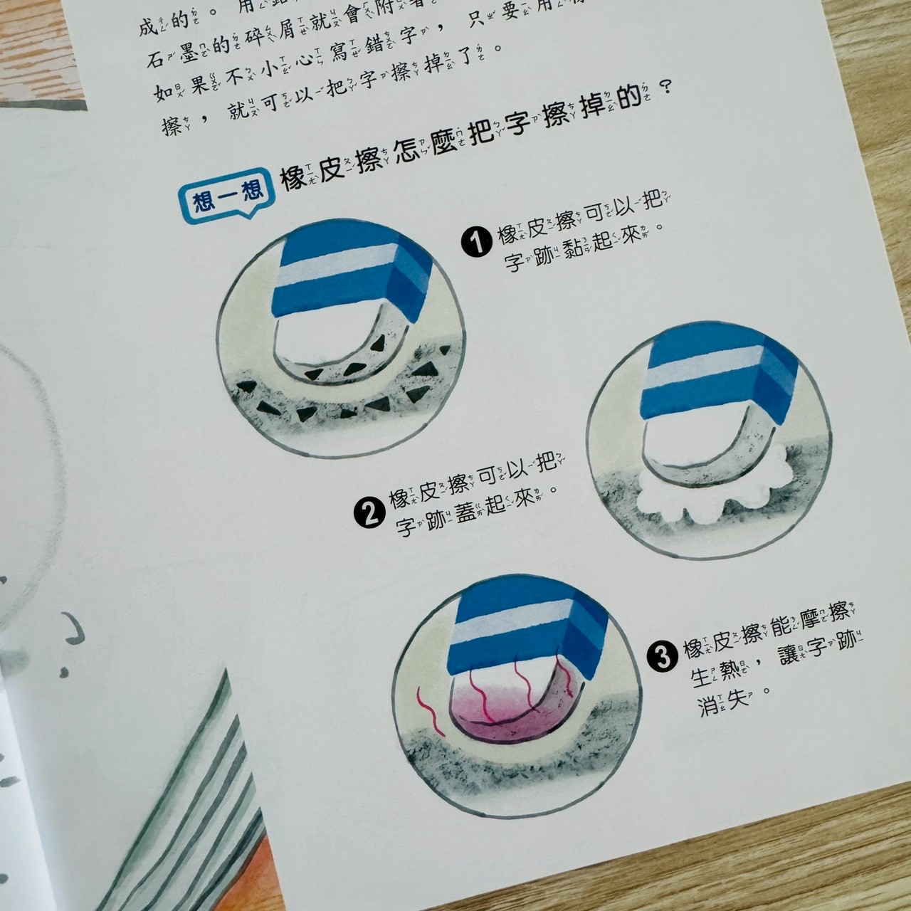 書裡的設計會先丟出幾個可能的選項,引導孩子停下來想一想,再帶到正解。學到的不是知識,而是「思考的方法」。 -