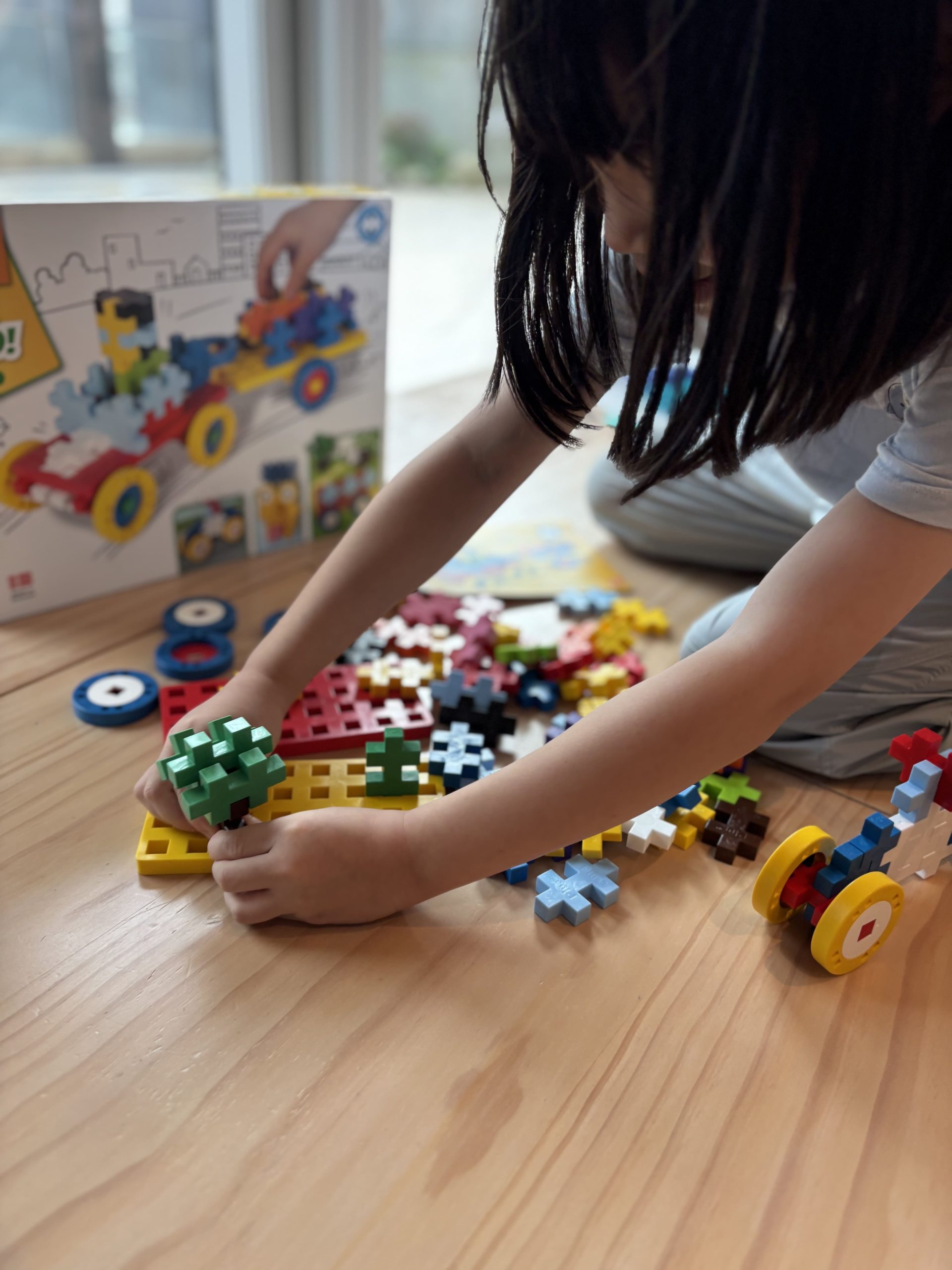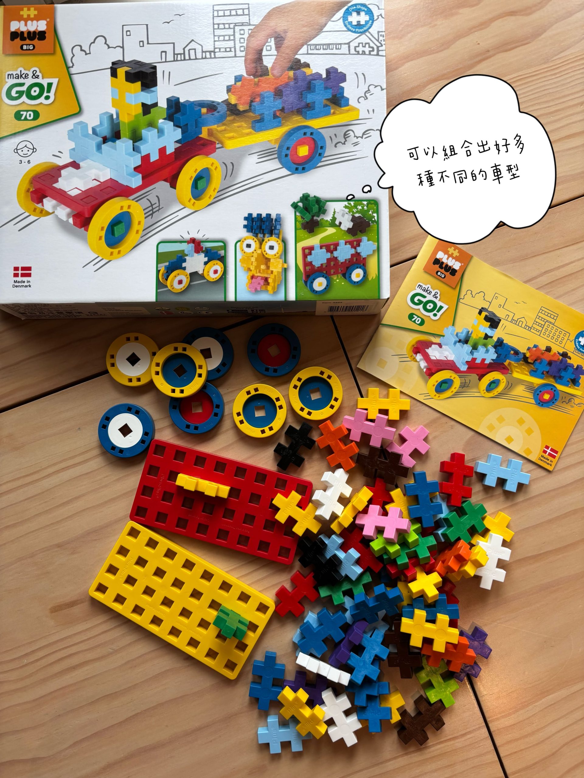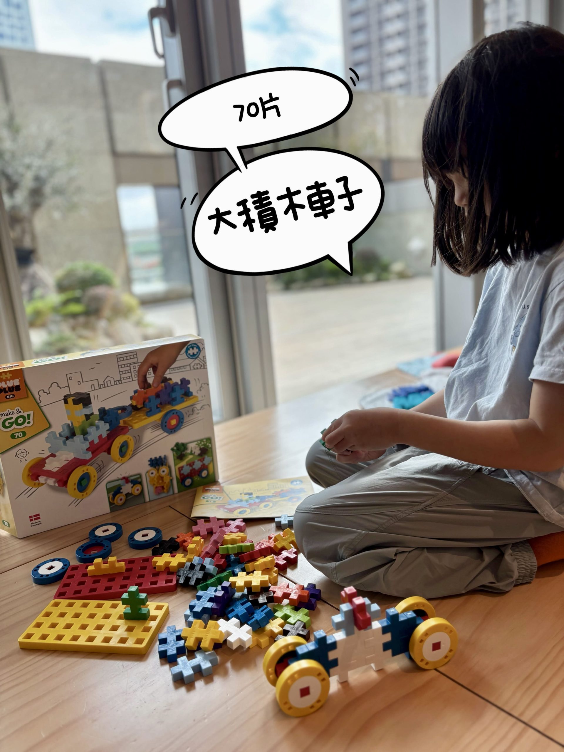 大積木(PlusPlus Midi 5 cm)車車版本很適合年紀較小(官方建議一歲以上)的孩子,大顆好拿,能搭配基礎形狀組出簡單的車體、房子、橋樑,玩起來安全又直覺。