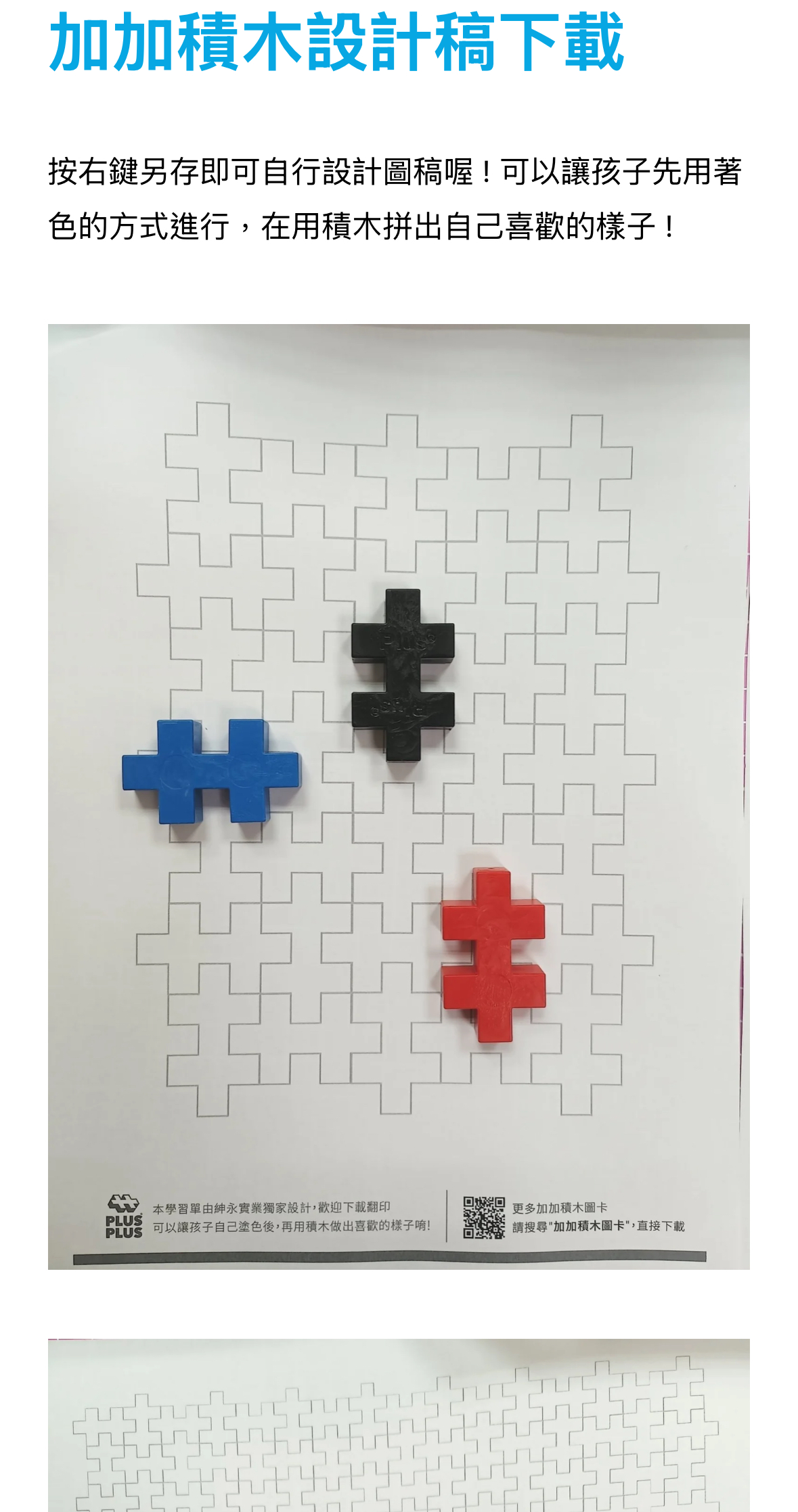 還可以讓孩子先用著色的方式在設計稿自行設計圖稿,再用積木拼出自己喜歡的樣子 !