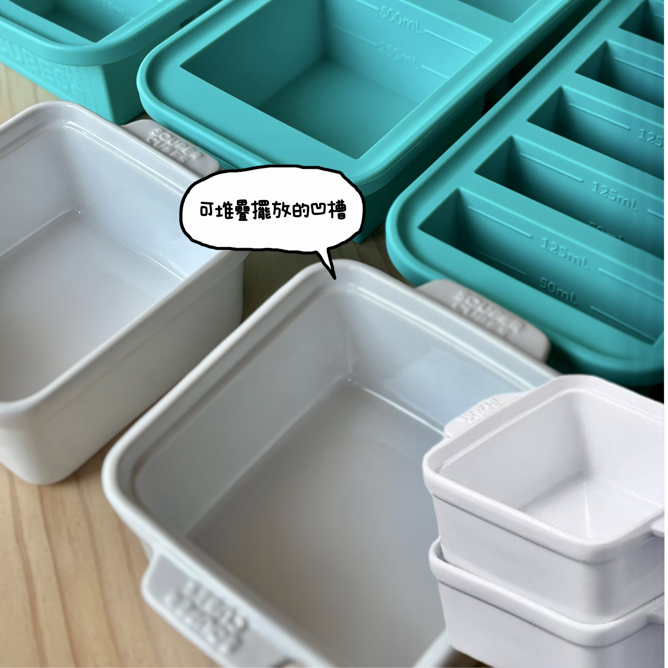 另外我也很推薦他們家的 陶瓷烤盅,尺寸是通用 保鮮盒 2格(500ML/格) 的。 冷凍好的冰磚可以直接放進烤盅,再送進微波或烤箱(安全溫度 232 度)加熱就好;可堆疊+專屬上蓋的設計也很貼心,整套搭起來就是「備料到上桌」一次到位。